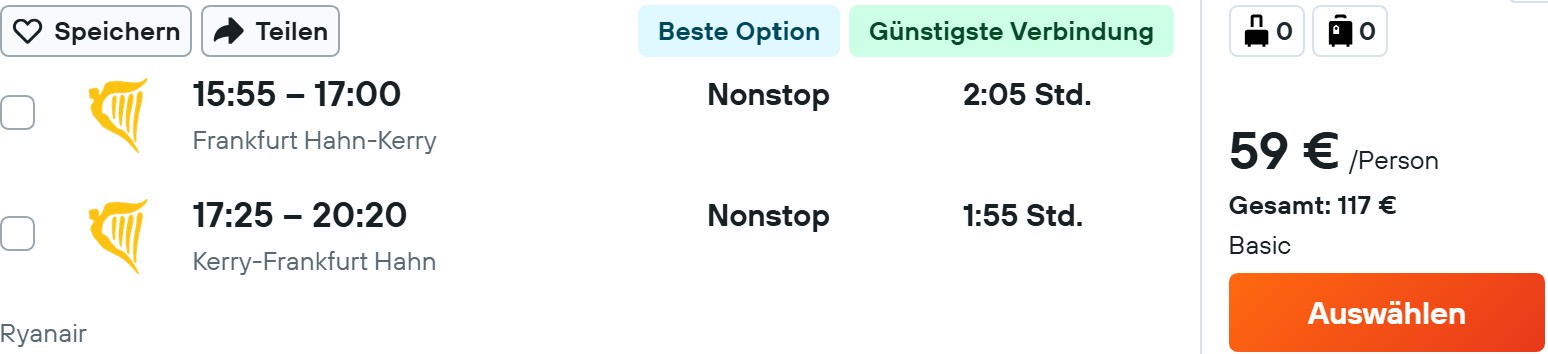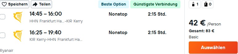 Passen euch Abflughafen oder Termin nicht, sind die Verbindungen von Köln nach Knock (Ryanair) sowie von Frankfurt nach Shannon (Discover) oder Cork (Lufthansa) gute, aber teurere Alternativen. Vorteil dieser Flüge ist, dass ihr sie zu ähnlichen Preisen auch mit Zubringer von fast allen anderen Airports im deutschsprachigen Raum buchen könnt.