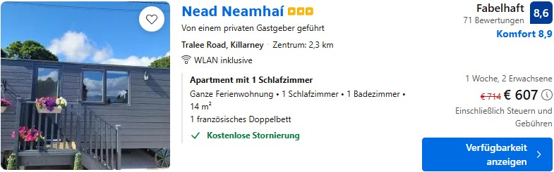 Bucht ihr die einzelnen Bausteine der Reise dagegen einzeln, klappt es sogar für unter 400€ wie unser Beispielurlaub hier im Artikel zeigt. Enthalten sind die Flüge nonstop nach Kerry im wunderschönen Südwesten Irlands, ein voll versicherter Mietwagen sowie eine Ferienwohnung für Selbstversorger oder ein kleines Hotel mit Frühstück gegen einen kleinen Aufpreis.