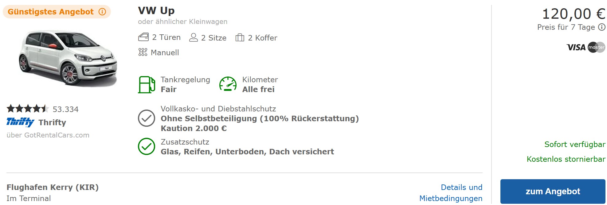 Super günstig und mit Abholung direkt am kleinen Terminal vom Flughafen Kerry bekommt ihr einen Mietwagen schon ab 120€ für 1 Woche in der Nebensaison. Vollkasko, Diebstahlschutz und Versicherungen für Glas, Reifen, Boden und Dach sind schon dabei, und zwar ohne Selbstbeteiligung.
