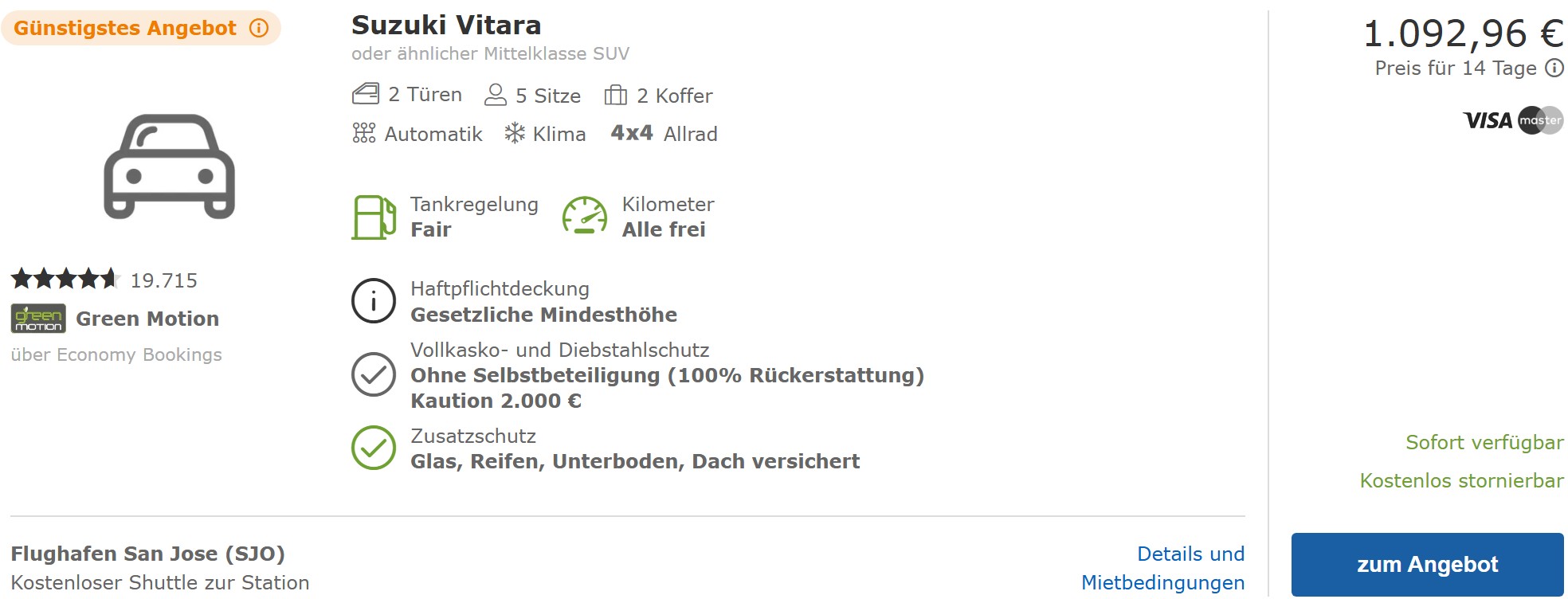 Einen Mittelklasse-Wagen für 2 Wochen bekommt ihr inklusive Einwegmietgebühr (Übergabe in San Jose und Abgabe in Liberia) für etwas unter 900€. Unserer Meinung nach reicht dieser für 2 Erwachsene in der Trockenzeit gut aus. Wenn ihr euch auf Abwege wagen wollt, bucht ihr besser ein Auto mit Allrad-Antrieb. Die Preise beginnen bei knapp 1.100€.