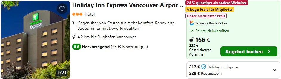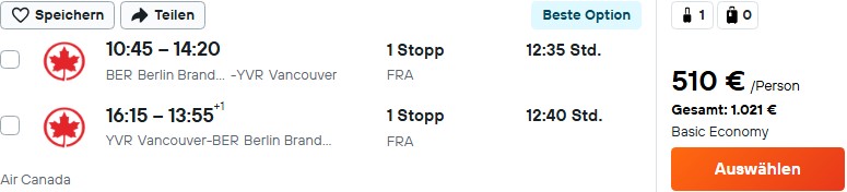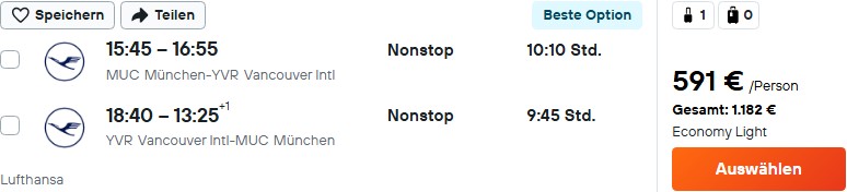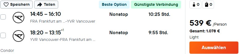 Die Gesamtkonkurrenzsituation sorgt dann entsprechend für relativ günstige Preise. So geht es nonstop von Frankfurt schon ab 539€ nach Vancouver, von München ab 591€. Mit Umstieg startet ihr für 510€ von Berlin zum besten Preis.