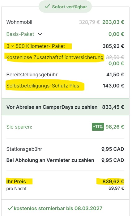 Weitere optionale Zusatzpakete beinhalten die Küchenausstattung, Bettwäsche und Handtücher oder Campingstühle. Hier solltet ihr schauen, was ihr davon wirklich braucht bzw. was ihr euch auch vor Ort noch bedarfsweise besorgen oder von zu Hause mitbringen könnt.