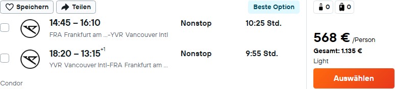 Neben der Auswahl einer guten Flugverbindung solltet ihr auch die unterschiedlichen Gepäckbedingungen im Auge behalten. Condor ist dabei besonders strikt und erlaubt im günstigsten Zero-Tarif nur kleines Gepäck, das unter den Vordersitz passt. Bei Lufthansa und Air Canada ist ein kleines Gepäck und ein Kabinentrolley inklusive.