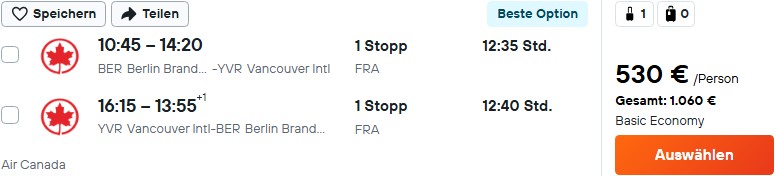 Die Gesamtkonkurrenzsituation sorgt aber dann für relativ günstige Preise. So geht es nonstop von Frankfurt schon ab 568€ nach Vancouver, von München ab 591€. Mit Umstieg startet ihr für 530€ von Berlin zum besten Preis.