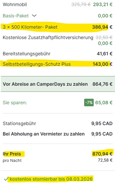 Auch bei den Freikilometern solltet ihr nachrechnen. Nehmt dazu eure geplante Route und schlagt nochmal 25% für kleinere Umwege und unvorhergesehene Abstecher drauf. Für die klassischen Routen mit 12 – 14 Tagen reichen im Normalfall 1500 bis 2000 Kilometer, so dass sich das Paket mit unbegrenzten Kilometern eher selten lohnt.
