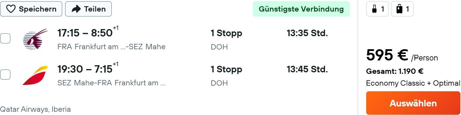Günstige Flüge auf die Seychellen sind leider Mangelware. Unter 800€ findet ihr nur sehr wenige Termine. wenn ihr maximal einmal umsteigen und nicht mehr als 15 Stunden unterwegs sein wollt.
