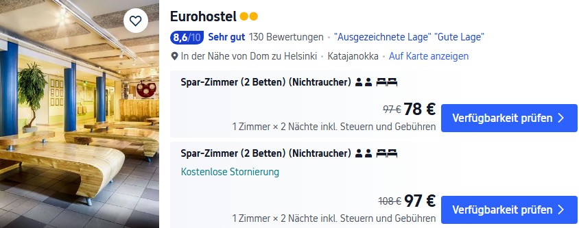 In Helsinki sieht die Lage deutlich entspannter aus, dafür sinken die Chancen auf Nordlichter aber auch mit jedem Kilometer, den ihr südlicher kommt. Unsere Empfehlungen im Beispielzeitraum findet ihr unten. Neben den klassischen Ketten wie Scandic und Radisson gibt es inzwischen auch günstigere Aparthotels im Zentrum. Außerdem bekommt ihr für kleines Geld auch ein privates Doppelzimmer im Hostel.