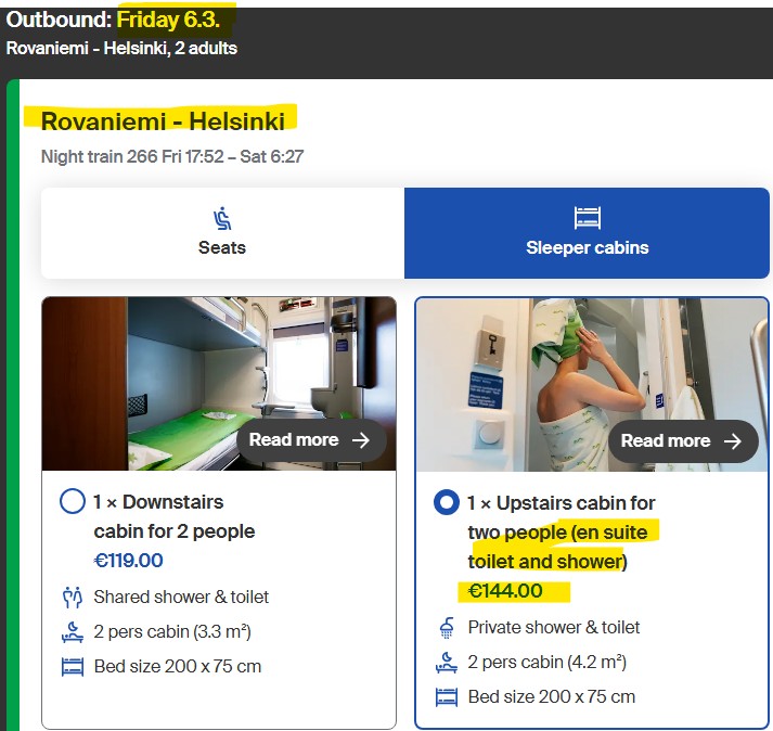 Wie fast überall arbeitet auch die Finnische Bahn mit Sparpreisen, so dass ihr im Idealfall so früh wie möglich bucht. Nicht selten kommt es auch vor, dass die Schlafwagenabteile aller Züge ausverkauft sind. Da man das Auto mitnehmen kann, sind die Züge auch bei finnischen Autofahrern äußerst beliebt, um sich die lange anstrengende Fahrt gerade im Winter zu ersparen.