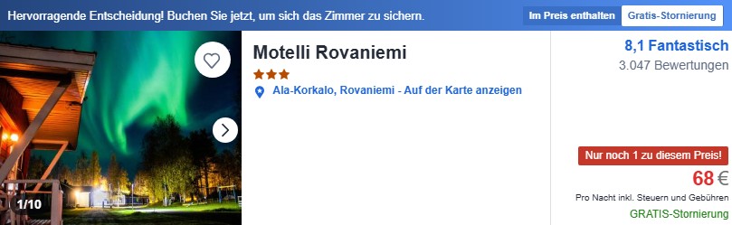 In unserem Artikel zeigen wir euch, wie ihr eine solche Reise recht einfach selbst planen könnt. Schon für 359€ pro Person bei Kostenteilung zu zweit bekommt ihr 3 Nächte in Rovaniemi, 2 Nächte in Helsinki, die Fahrt mit dem Nachtzug zwischen den beiden Städten im privaten Schlafabteil mit eigener Dusche sowie die Flüge.