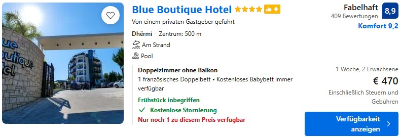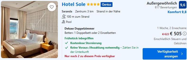 Auch wenn noch nicht alle Veranstalter Albanien als Ziel für eine Pauschalreise entdeckt haben, findet ihr bereits eine recht große Auswahl an Hotels. Wir haben euch diese im Paket mit Flügen und Transfers in unserer Reisesuche verlinkt, falls euch die Einzelbuchung der Leistungen zu aufwendig oder kompliziert ist.