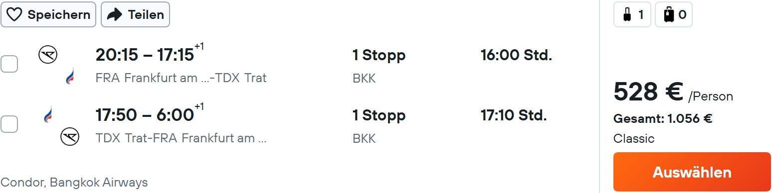 Das hat gleich mehrere Vorteile. Zum einen habt ihr kein Anschlussrisiko in Bangkok, sondern werdet im Falle von Verspätungen auf den nächsten Flieger umgebucht und notfalls in einem Hotel untergebracht. Zum zweiten spart ihr so einen Teil der hohen Monopolkosten, die Bangkok Airways für den einstündigen Flug von Bangkok nach Trat verlangt. Und nicht zuletzt führt diese Codeshare-Verbindung noch dazu, dass selbst im günstigsten Tarif von Condor das Aufgabegepäck schon dabei ist. Bucht ihr nur bis Bangkok, zahlt ihr dafür allein über 100€ extra. Die Preise beginnen aktuell bei 528€.