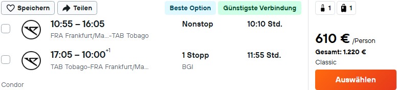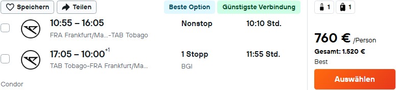 Äußerst günstige Flüge bekommt ihr momentan für die Karibikinsel Tobago. Dorthin fliegt Condor im Winterflugplan jeden Dienstag zu Preisen ab 479€. Von Frankfurt aus geht es hinzu nonstop, zurück mit kurzem Stopp auf Barbados. Dadurch bekommt ihr sehr attraktive Flugzeiten.