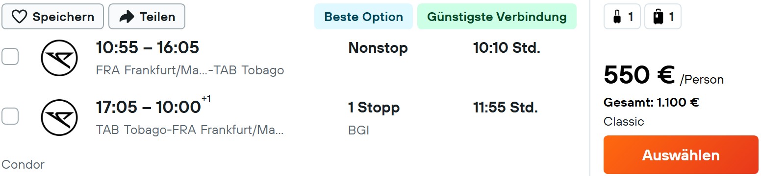 Äußerst günstige Flüge bekommt ihr momentan für die Karibikinsel Tobago. Dorthin fliegt Condor im Winterflugplan jeden Dienstag zu Preisen ab 412€. Von Frankfurt aus geht es hinzu nonstop, zurück mit kurzem Stopp auf Barbados. Dadurch bekommt ihr sehr attraktive Flugzeiten.