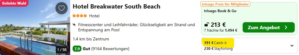 Wollt ihr mitten im Trubel sein und den Komfort eines 4* Hotels genießen ohne arm zu werden, dann schaut euch das Hotel Breakwater South Beach an. Es liegt direkt am Ocean Drive, also nur wenige Schritte vom Strand sowie den Clubs und Bars entfernt. Ein weiteres Highlight ist der Rooftop Pool. Für so viel Luxus und Lage ist der Preis von knapp 200€ pro Nacht ein echtes Schnäppchen, zumal in der Hauptsaison im März.