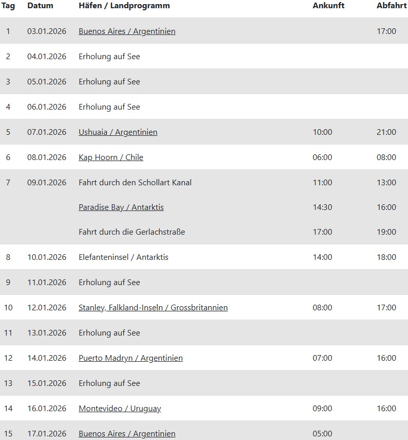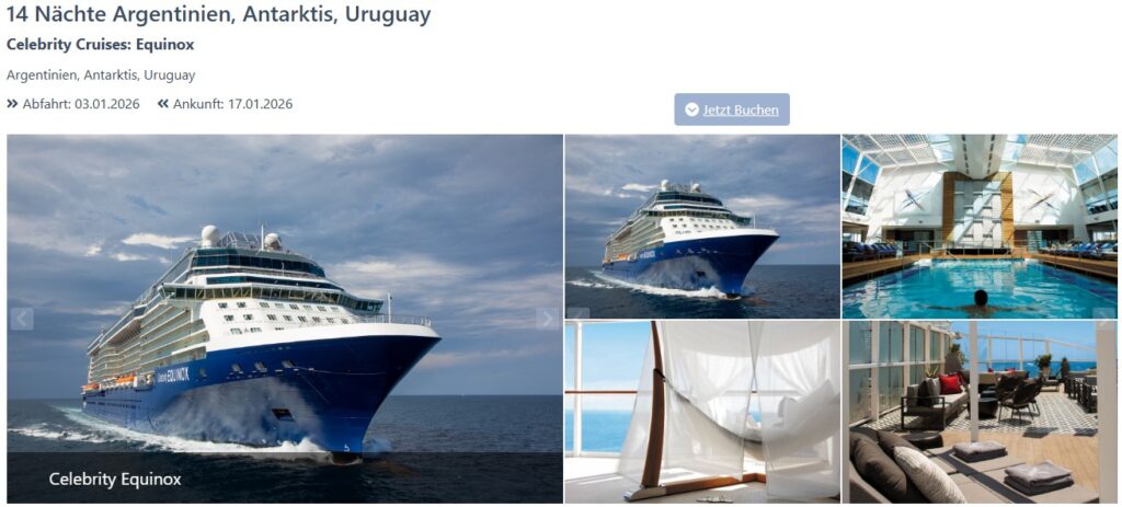 Den mit gro0em Abstand besten Preis für diese Kreuzfahrt bekommt ihr Anfang bis Mitte Januar 2026. Alle anderen Termine sind deutlich teurer oder bereits ausgebucht. Hinweise zur Anreise nach Buenos Aires findet ihr unten.