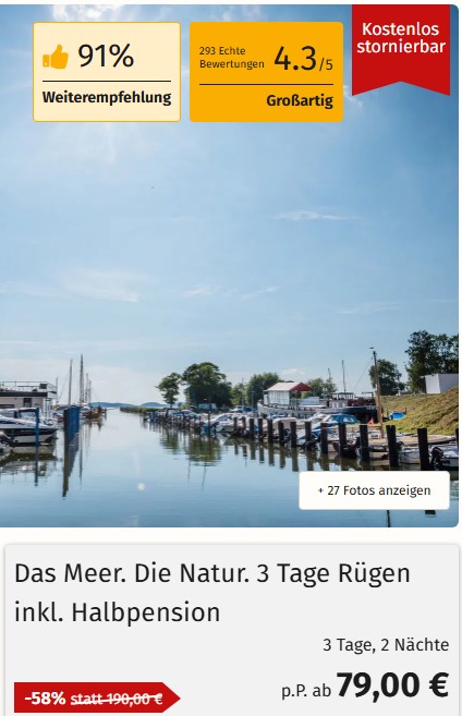 Bei Kurz-mal-weg findet ihr aktuell einige sehr attraktive Kurz- und Wellnessreisen an die Ostsee. Besonders spannend vom Preis-Leistungsverhältnis finden wir die in den letzten Jahren rund um die Marina Martinshafen auf Rügen entstanden Ferienwohnungen. Diese könnt ihr aktuell nämlich schon ab 79€ pro Person inklusive Halbpension für 3 Tage bzw. 2 Nächte buchen. Wer länger als ein Wochenende bleiben möchte, bekommt auch 5 Tage / 4 Nächte für 159€.