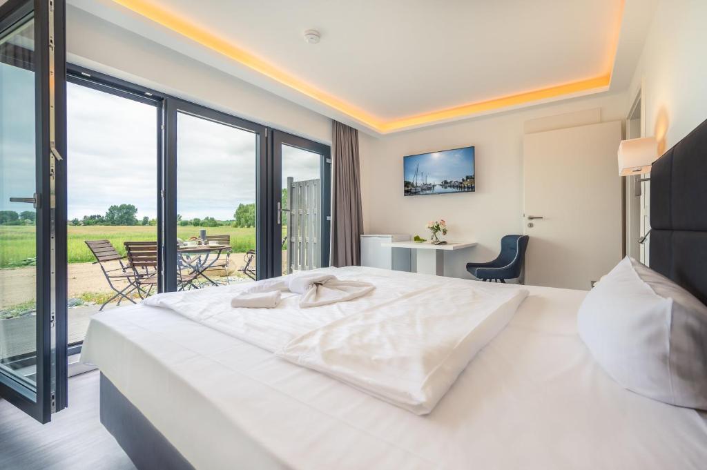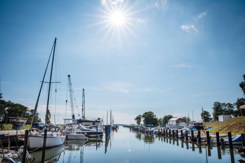 Die Marina Martinshafen liegt im Norden der Insel Rügen etwa 5 Kilometer von Sassnitz entfernt. Rund um den Hafen findet ihr verschiedene Häuser, Bungalows und sogar Hausboote. Letztere kosten natürlich ein paar Euro mehr.