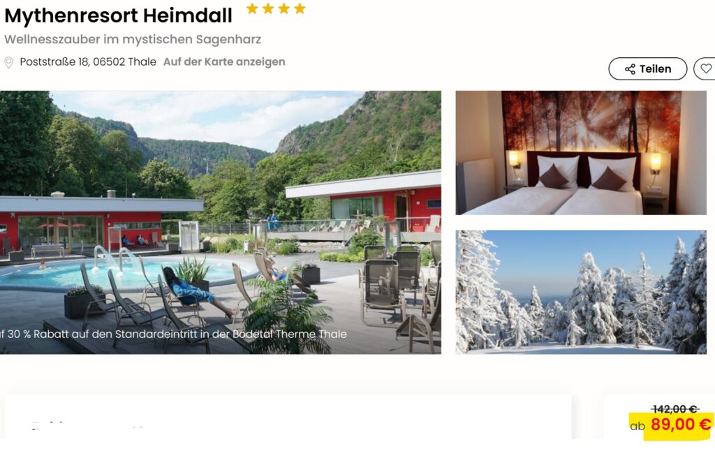Ein gutes Beispiel dafür ist das 4* Mythenresort Heimdall. Es liegt im Stadtzentrum von Thale nur wenige Schritte von den Seilbahnen entfernt, die euch zu den oben genannten berühmten Aussichtspunkten bringen. Den Bahnhof Thale erreicht ihr in 3 Fußminuten und könnt von dort in wenigen Minuten nach Quedlinburg und Halberstadt fahren. Vom davor liegenden Busbahnhof erreicht ihr nahezu alle Orte im Ostharz.