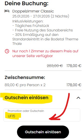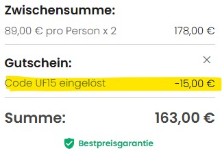 Nutzt ihr dazu noch unseren Gutscheincode UF15, sinkt der Preis auf 163€ zu zweit bzw. 81,50€ pro Person, wenn ihr euch die Kosten teilt.