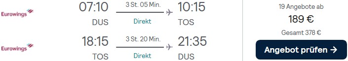 Besonders preiswert könnt ihr diesen Winter von Berlin nach Tromsø düsen. Kein Wunder, mit easyJet, Norwegian und Eurowings buhlen gleich drei Billigflieger um eure Gunst. Direkte Flüge gibt es auch von Düsseldorf, Hamburg und Stuttgart mit Eurowings, Frankfurt und München mit Lufthansa sowie von Wien mit Austrian und Zürich mit edelweiss. Allerdings zu deutlich höheren Preisen.