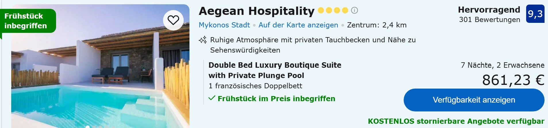 Ein gutes Beispiel dafür sind die Aegean Hospitility Suites. Hier bekommt ihr eine Suite mit Schlaf- und Wohnbereich, Küche und eigenem Pool schon ab 861€ für 7 Nächte. Teilt ihr euch die Kosten zu zweit, landet ihr so bei nur 431€ pro Person.