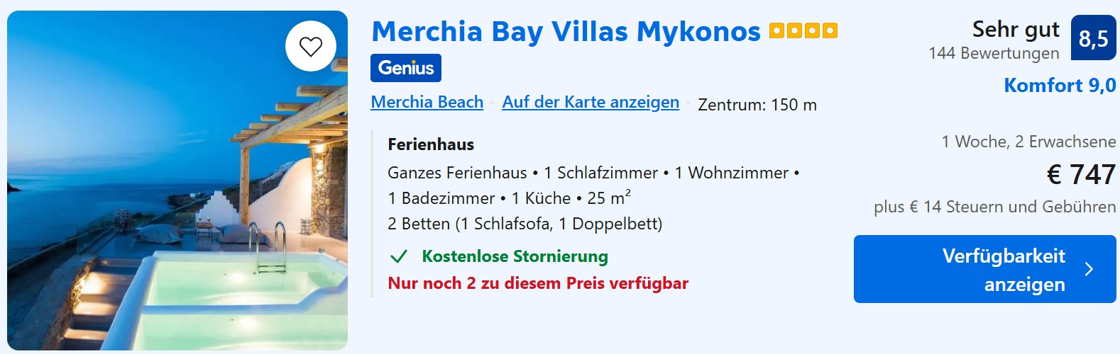 Auch wenn Mykonos den Ruf als überteuerte Insel der Stars und Sternchen hat, könnt ihr hier zu durchaus akzeptablen Preisen einen tollen Urlaub verbringen. Etwas außerhalb der Partybrennpunkte findet ihr zahlreiche Ferienwohnungen und Häuser mit Pool in schöner Lage oberhalb des Meeres.