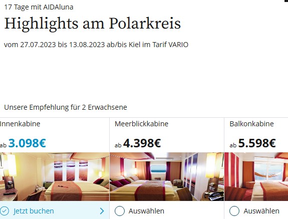 Buchen könnt ihr jeweils den VARIO-Tarif mit zufälliger Kabinenwahl oder den PREMIUM-Tarif mit eigener Kabinenwahl. Beide gibt es auch mit All Inclusive-Paket, in dem die meisten Getränke von der Bar sowie der Internetzugang für Social Media bereits enthalten ist.