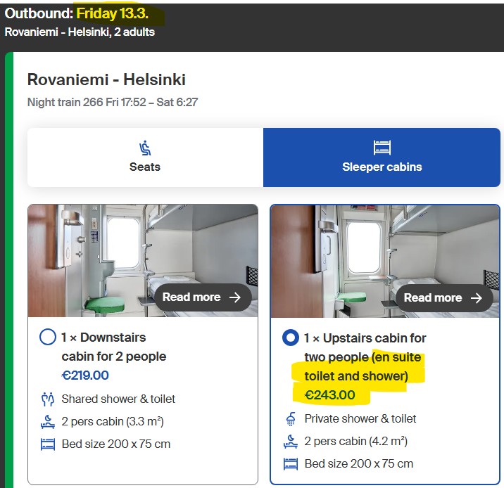 Wie fast überall arbeitet auch die Finnische Bahn mit Sparpreisen, so dass ihr im Idealfall so früh wie möglich bucht. Nicht selten kommt es auch vor, dass die Schlafwagenabteile aller Züge ausverkauft sind. Da man das Auto mitnehmen kann, sind die Züge auch bei finnischen Autofahrern äußerst beliebt, um sich die lange anstrengende Fahrt gerade im Winter zu ersparen.