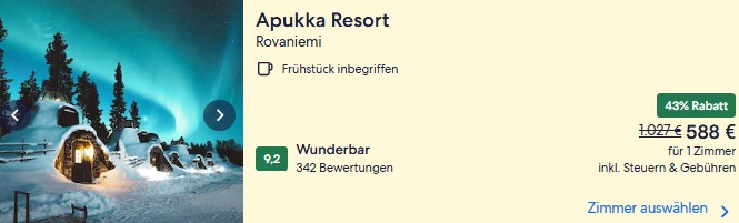 In Helsinki sieht die Lage deutlich entspannter aus, dafür sinken die Chancen auf Nordlichter aber auch mit jedem Kilometer, den ihr südlicher kommt. Unsere Empfehlungen im Beispielzeitraum findet ihr unten. Neben den klassischen Ketten wie Scandic und Radisson gibt es inzwischen auch günstigere Aparthotels im Zentrum. Außerdem bekommt ihr für kleines Geld auch ein privates Doppelzimmer im Hostel.