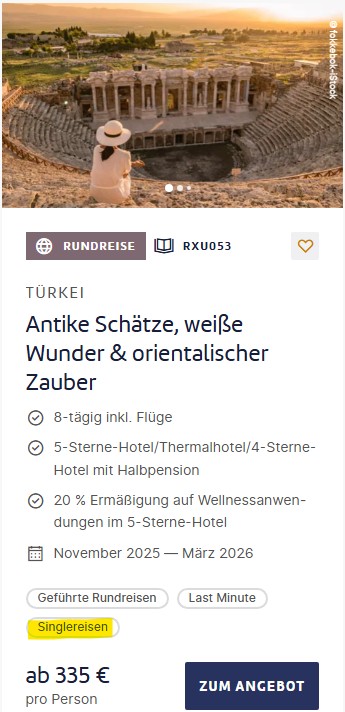 Bei Berge & Meer könnt ihr noch bis Ende August Rundreisen für Singles ohne Einzelzimmer-Zuschlag buchen. Zur Auswahl stehen über 200 Angebote in der ganzen Welt. Die Flüge sind schon inklusive und meist auch Halbpension.