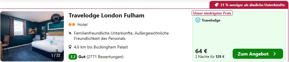- Je zentraler das Hotel, desto teurer wird es. Mit weniger Budget macht es Sinn, den Radius um das Londoner Zentrum auf 5 bis 7 Kilometer zu erweitern. Mit ganz kleinem Budget schaut ihr am besten an den Endstationen der U-Bahn oder Bahnhöfen von Regionalzügen, damit ihr trotzdem schnell und günstig in die Stadt kommt.