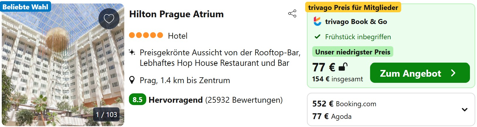 Tipp: Aktuell gibt es auch das Hilton Prag äußerst günstig. Bei Aufenthalten mit maximal 2 Übernachtungen übers Wochenende ist sogar das Frühstück inklusive. So könnt ihr 2 Nächte Mitte Februar schon für 77€ pro Person bei 2 Erwachsenen buchen.