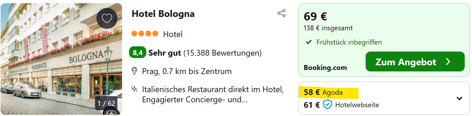 Klare Sieger unserer Analyse ist das Hotel Bologna. Es liegt mitten in der Prager Altstadt etwa 5 Minuten zu Fuß von der Karlsbrücke entfernt. Mehrere Straßenbahn-Linien sind ebenfalls gleich um die Ecke, so dass ihr direkt zum Hauptbahnhof, zum Busbahnhof oder hinauf zur Prager Burg fahren könnt. Das Hotel bekommt überall sehr gute Bewertungen, auch aufgrund der individuellen Einrichtung.