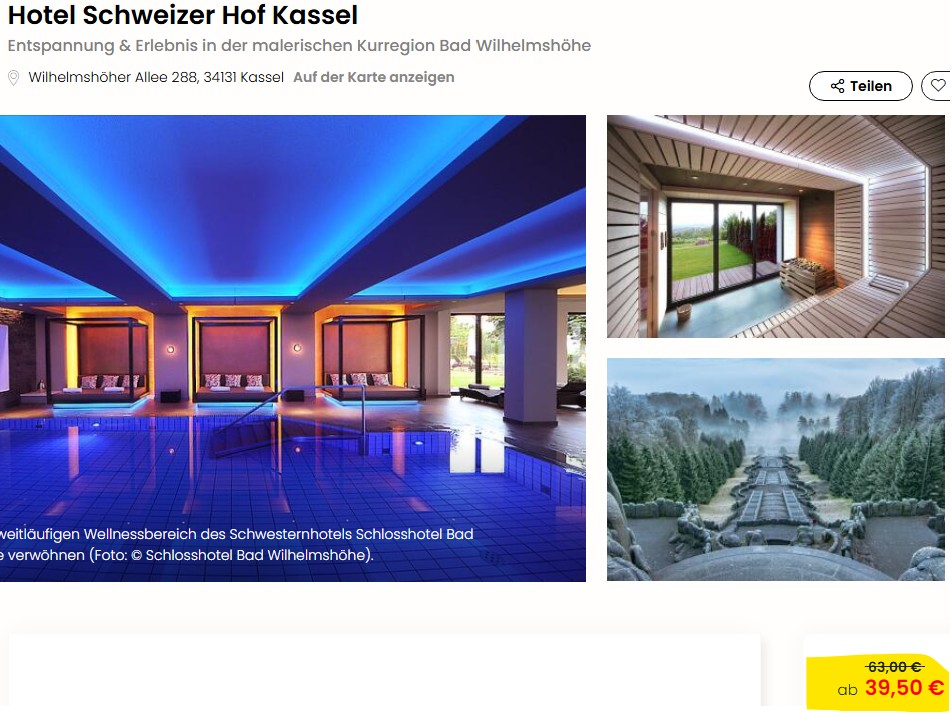 Super günstig könnt ihr aktuell bei Travelcircus das Hotel Schweizer Hof in Kassel schon für 79€ zu zweit im Doppelzimmer buchen. Teilt ihr euch die Kosten zu zweit, zahlt ihr also nur 39,50€ pro Person. In vielen Hotels kostet inzwischen allein das Frühstück schon so viel. Und das ist hier bereits inklusive.