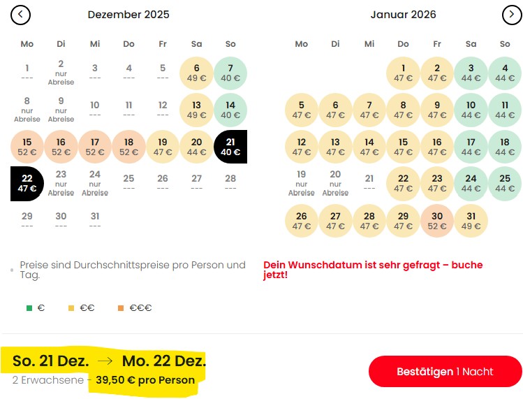 Im Monatskalender von Travelcircus findet ihr alle verfügbaren Termine und den jeweiligen Preis auf einen Blick. Die günstigste Rate gibt es in der Regel in der Nacht von Sonntag auf Montag. Aber die Aufpreise an den übrigen Terminen halten sich in Grenzen. Ihr landet eigentlich immer bei maximal 52€ pro Person und Nacht, was um einiges günstiger als die Raten beim Hotel selbst oder auf Portalen wie booking.com ist. Buchen könnt ihr bis Dezember 2026, euch also auch jetzt schon beliebte Termine wie Valentinstag oder die Feiertage im Mai sichern.