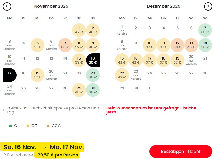 Im Monatskalender von Travelcircus findet ihr alle verfügbaren Termine und den jeweiligen Preis auf einen Blick. Die günstigste Rate gibt es in der Regel in der Nacht von Sonntag auf Montag. Aber die Aufpreise an den übrigen Terminen halten sich in Grenzen. Ihr landet eigentlich immer bei maximal 50€ pro Person und Nacht, was um einiges günstiger als die Raten beim Hotel selbst oder auf Portalen wie booking.com ist. Buchen könnt ihr bis Dezember 2026, euch also auch jetzt schon beliebte Termine wie Valentinstag oder die Feiertage im Mai sichern.