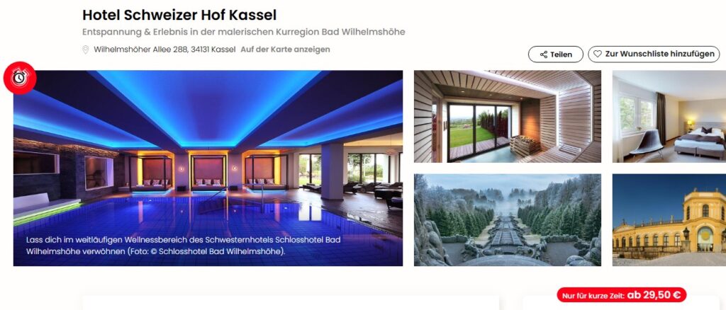 Super günstig könnt ihr aktuell bei Travelcircus das Hotel Schweizer Hof in Kassel schon für 59€ zu zweit im Doppelzimmer buchen. Teilt ihr euch die Kosten zu zweit, zahlt ihr also nur 29,50€ pro Person. In vielen Hotels kostet inzwischen allein das Frühstück schon so viel. Und das ist hier bereits inklusive.