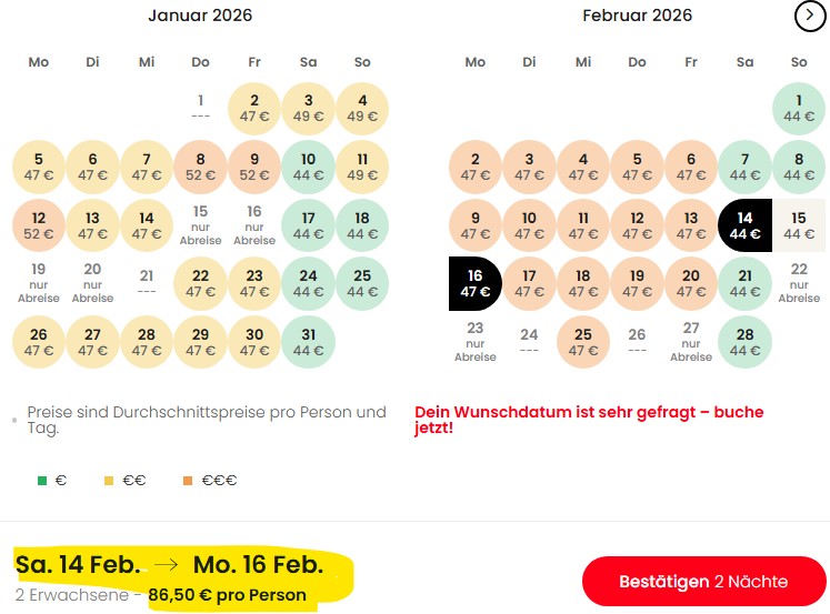 Aber die Aufpreise an den übrigen Terminen halten sich in Grenzen. Ihr landet eigentlich immer bei maximal 52€ pro Person und Nacht, was um einiges günstiger als die Raten beim Hotel selbst oder auf Portalen wie booking.com ist. Buchen könnt ihr bis Dezember 2026, euch also auch jetzt schon beliebte Termine wie Valentinstag oder die Feiertage im Mai sichern.
