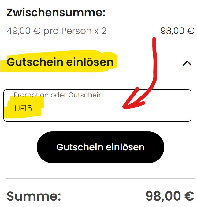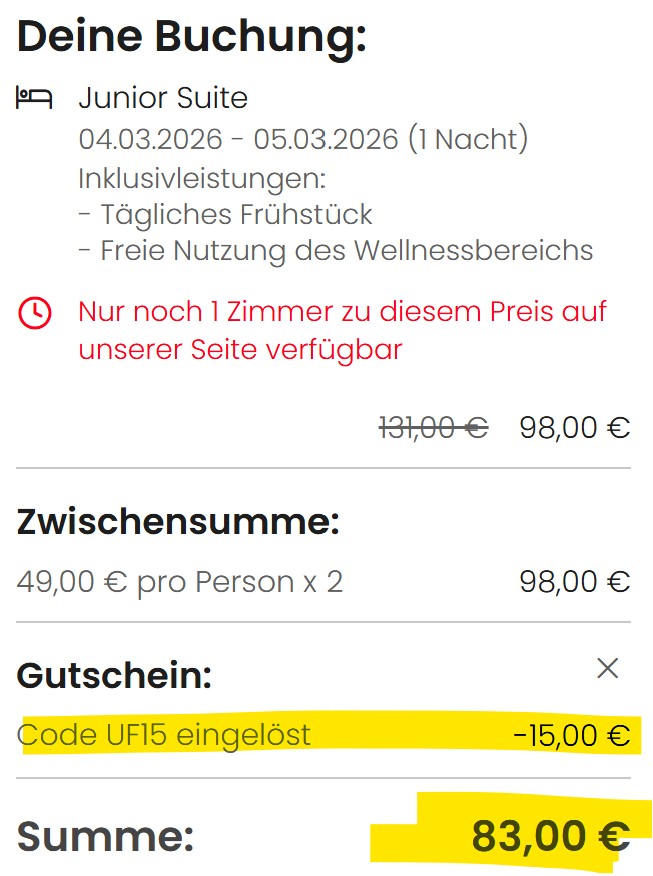 Nutzt ihr bei der Buchung unseren Gutscheincode UF15, spart ihr weitere 15€ ein. Dadurch kommt ihr auf einen Preis von 83€ für das Doppelzimmer, also 41,50€ pro Person bei 2 Erwachsenen.