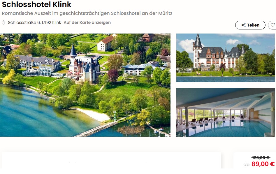 Das gleichnamige Schlosshotel Klink bekommt ihr aktuell bei Travelcircus zum absoluten Schnäppchenpreis von 89€ pro Person für 2 Nächte inklusive Frühstück.