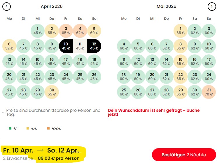 Im Kalender seht ihr sofort die verfügbaren Termine. Ihr könnt bei Verfügbarkeit auch länger bleiben. Von Berlin aus benötigt ihr mit dem Auto knapp 2 Stunden ins Hotel, von Hamburg sind es etwa 2,5 Stunden. Dadurch lohnt sich auch ein Kurztrip.