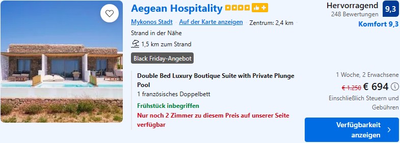 Ein gutes Beispiel dafür sind die Aegean Hospitility Suites. Hier bekommt ihr eine Suite mit Schlaf- und Wohnbereich, Küche und eigenem Pool schon ab 694€ für 7 Nächte. Teilt ihr euch die Kosten zu zweit, landet ihr so bei nur 349€ pro Person.
